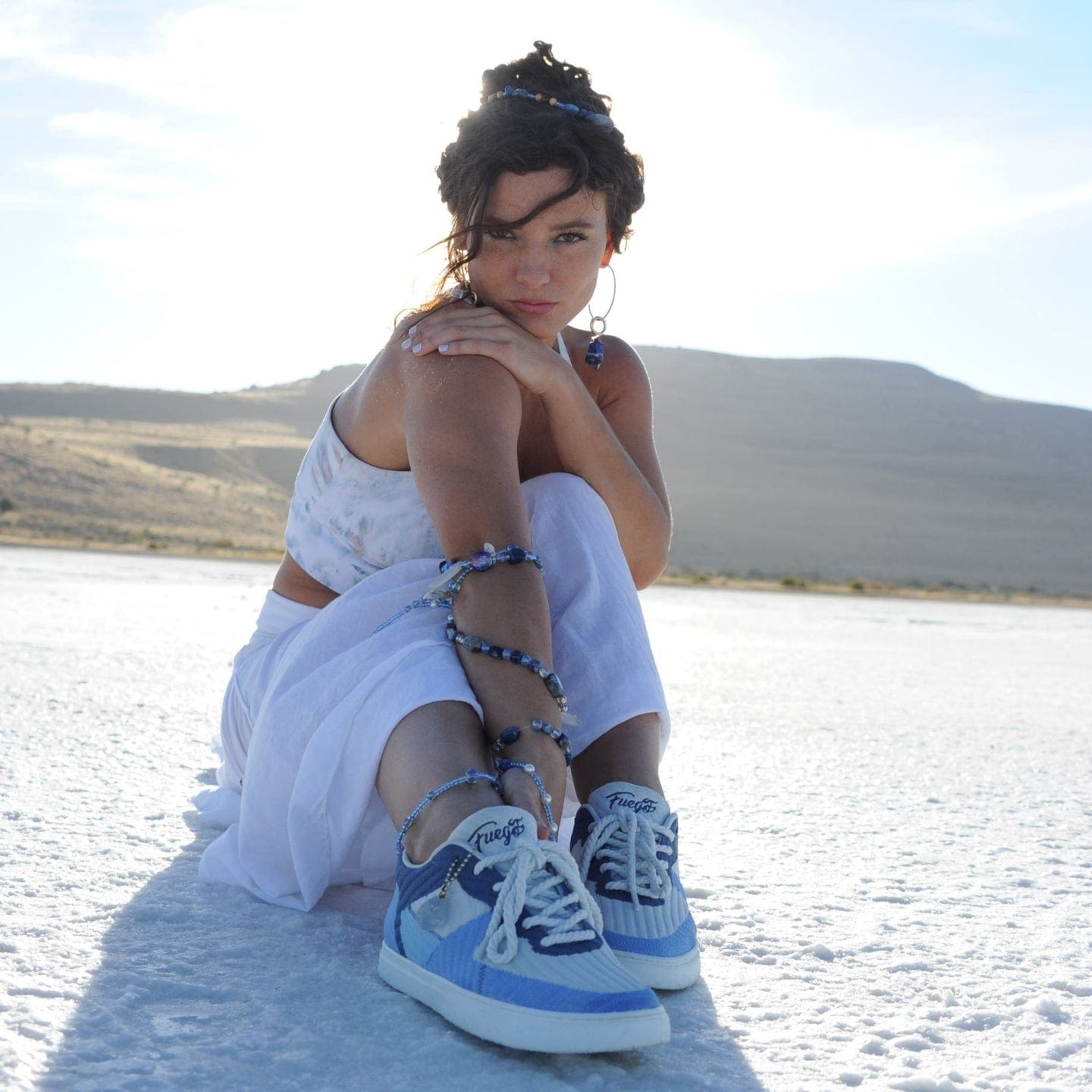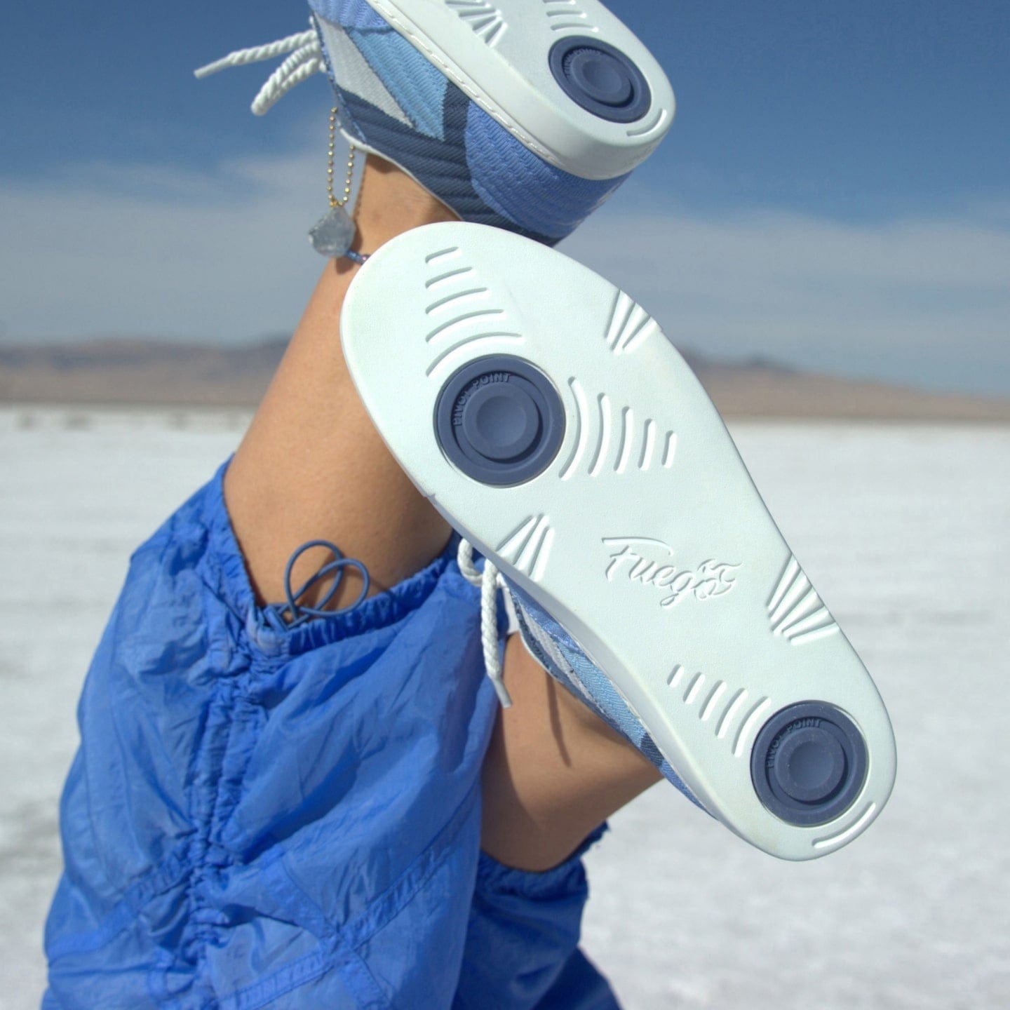 Diseñadas en colaboración con Jade Chynoweth, bailarina, actriz y sensación de las redes sociales de renombre mundial, estas zapatillas ecológicas presentan una piedra Celestita en bruto y una textura de tela de punto hecha de botellas de plástico recicladas. Haz olas en cualquier entorno cuando fluyas con tus Blue Jade x Fuego.