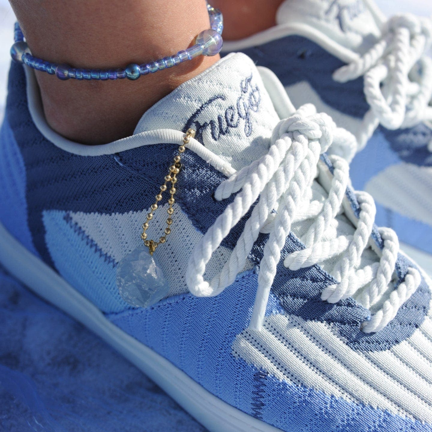 Inspirado en el océano, el diseño Blue Jade x Fuego Low-top imita el movimiento de las olas con una parte superior de tela tejida sostenible, elegantes cordones de cuerda y una serena piedra celestita que inspira tranquilidad.